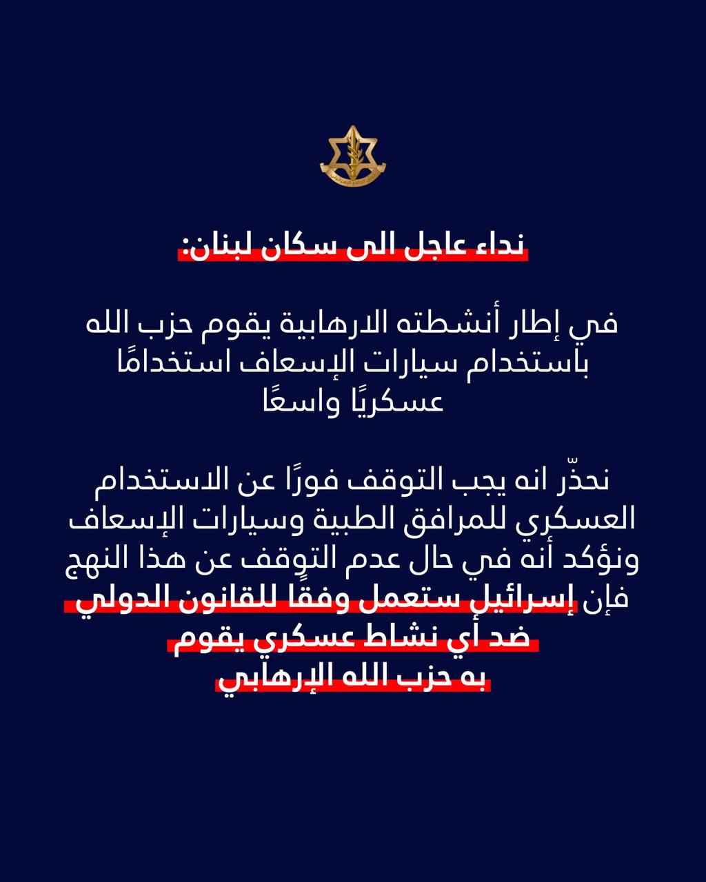 وجّه المتحدث بإسم الجيش الإسرائيلي إنذارا خطيراً الى سكان لبنان. وقال: في إطار أنشطته يقوم حزب الله باستخدام سيارات الإسعاف استخدامًا عسكريًا واسعًا. ودعا ادرعي “الحزب” للتوقف فورًا عن الاستخدام العسكري للمرافق الطبية وسيارات الإسعاف ونؤكد أنه في حال عدم التوقف عن هذا النهج فإن إسرائيل ستعمل وفقًا للقانون الدولي ضد أي نشاط عسكري يقوم به حزب الله مستخدمًا تلك المرافق وسيارات الإسعاف