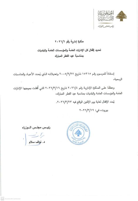 صدر عن رئاسة مجلس الوزراء قرار بتمديد إقفال جميع الإدارات العامة والمؤسسات العامة والبلديات بمناسبة عيد الفطر المبارك، حتى الإثنين المقبل.
